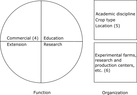(5) Agricultural research institutions tend to be subdivided into institutes, stations, departments, or other units, according to academic discipline (agricultural engineering, economics, microbiology, etc.), crop type (e.g., arable, orchard fruit) or location (sometimes reflecting climatic or other conditions in different parts of the territory).