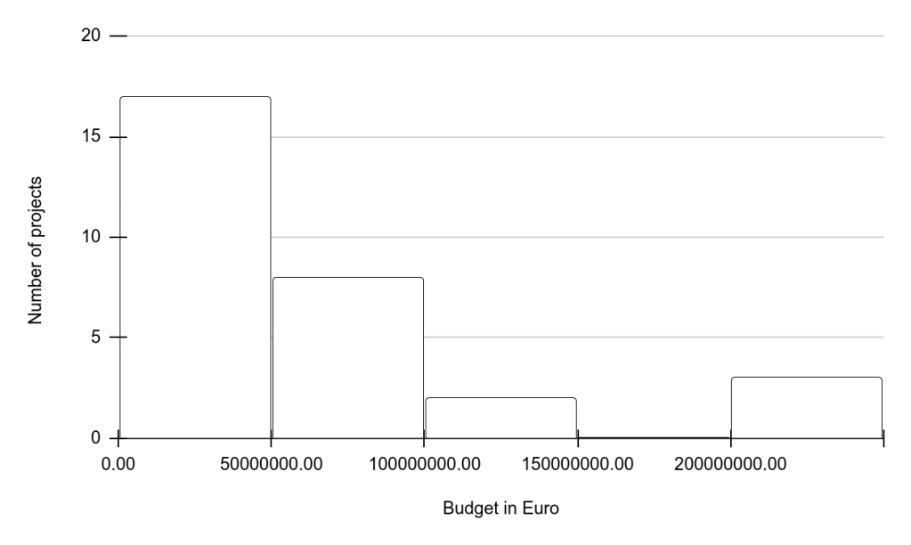 Looking at my estimated 1.7b Euro spent on around 30 projects across batteries, solar PV and wind turbines through the ETS Innovation Fund, the median project budget is 36m Euro with most below 50m Euro. But the telling point is that the TRL of projects cannot be known.